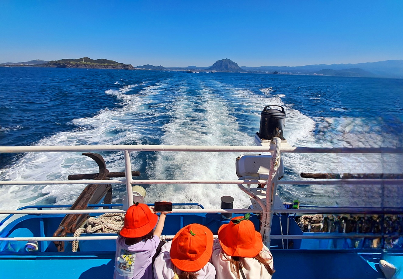 하늘과 바다가 맞닿은 국토 최남단 마라도를 향하는 여객선 후미에 나란히 앉은 세 요정들의 귀여운 모습입니다.